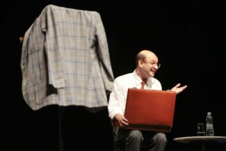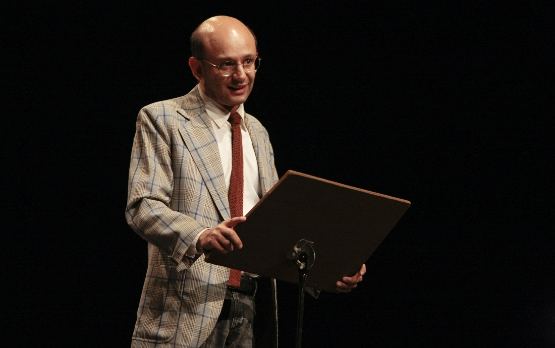 O cenário é composto de um púlpito, uma cadeira e um flip chart, tudo típico de uma palestra num Centro Cultural da vida.